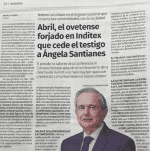 Asimismo, celebra el nombramiento de Ángela Santianes como nueva presidenta de la CCS, y destaca que “su candidatura ha sido de consenso, candidatura única, todo el mundo la apoya”. A su vez, hace hincapié en la trayectoria empresarial de Santianes, como alta directiva de empresa y el empeño que le dedica a  “promover el valor de la empresa en la sociedad, la necesidad de promover el emprendimiento dentro de la universidad y que esta se comprometa con la empresa”. Abril reconoce, además, que la nueva presidenta “lo hará muy bien” y garantiza que empresa y universidad hablen el mismo lenguaje, y se pueda realizar la esencial transferencia de resultados.