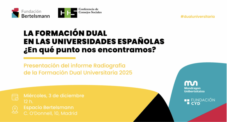 El próximo miércoles, 3 de diciembre, tendrá lugar la presentación del informe ‘Radiografía de la Formación Dual Universitaria 2025’, dirigida por la Fundación Bertelsmann, la
